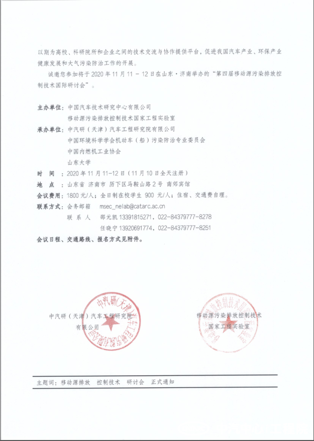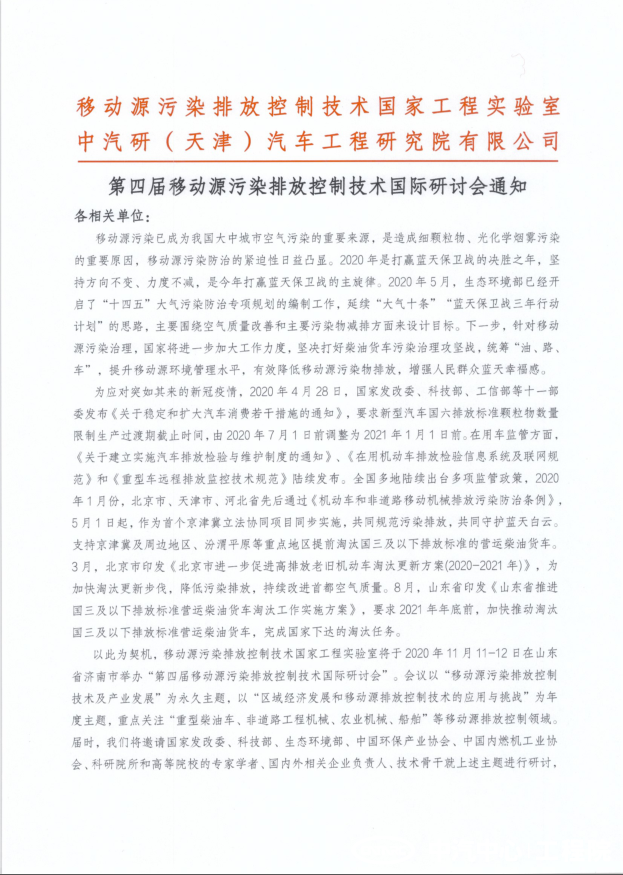 第四屆移動源污染排放控制技術國際研討會通知