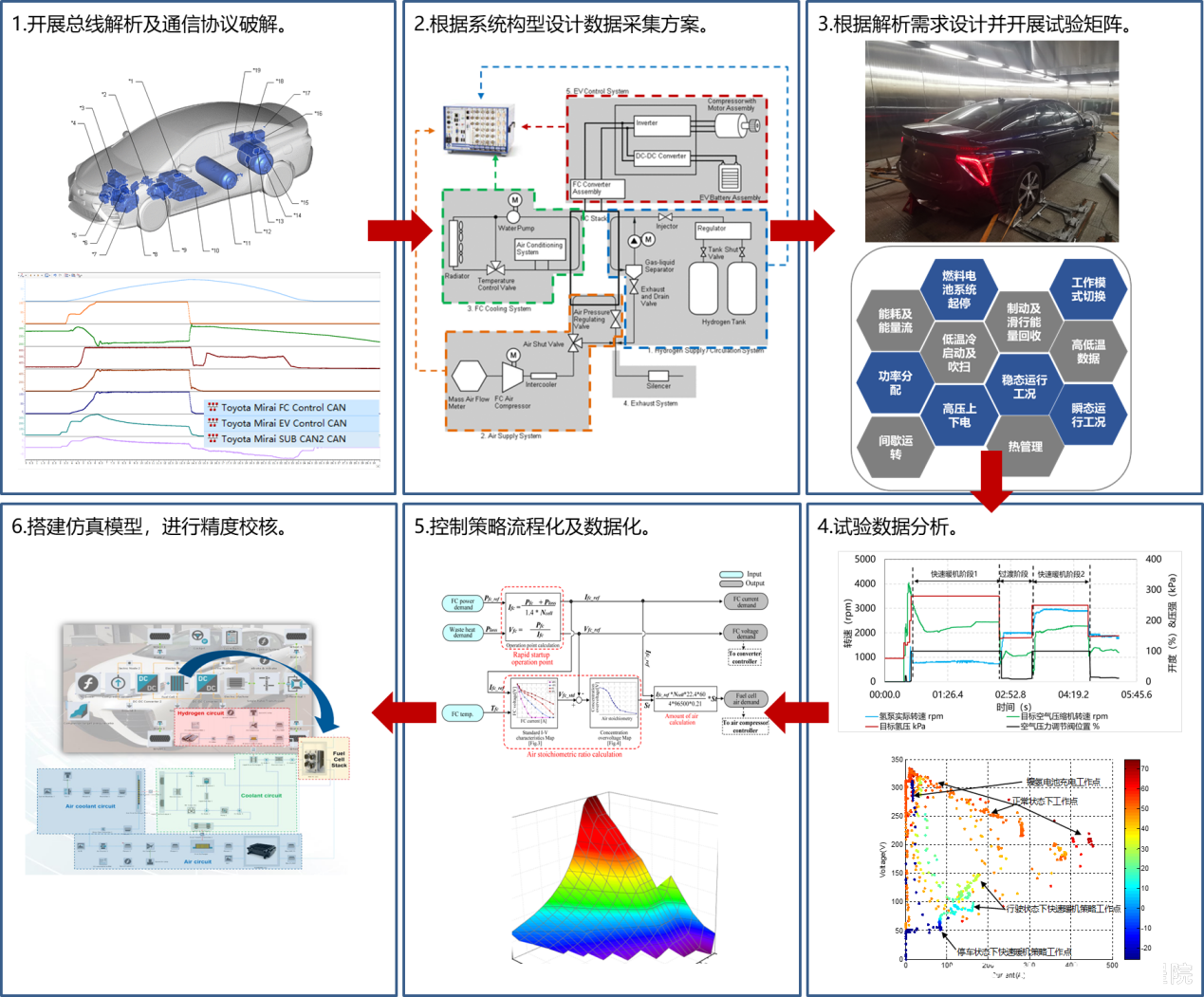 中汽中心工程院燃料電池團隊具備行業內最豐富的“燃料電池控制策略解析”技術,可提供信號交互邏輯、最小功能單元設計方法、關鍵閾值及Map,最大程度滿足燃料電池汽車/系統正向開發需求。