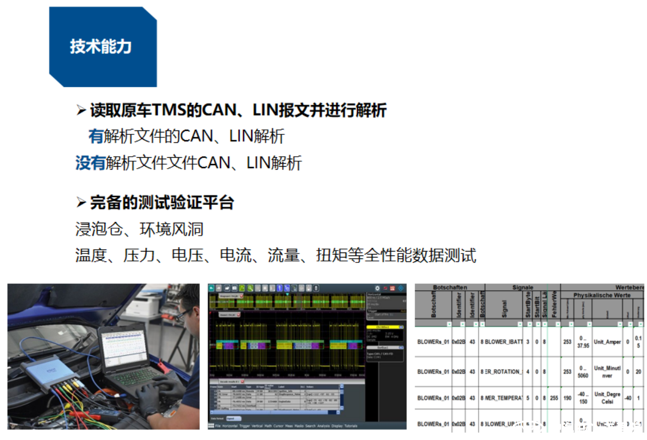 針對(duì)不同車型和熱管理架構(gòu)系統(tǒng),建立熱系統(tǒng)控制策略解析流程,定制化制定策略解析工況。目前團(tuán)隊(duì)具備了對(duì)各熱系統(tǒng)部件控制通信的CAN、LIN解析能力,同時(shí)可讀取原車熱系統(tǒng)的CAN、LIN報(bào)文并進(jìn)行解析的能力,通過整車布置全性能數(shù)據(jù)測(cè)試的傳感器,可實(shí)現(xiàn)對(duì)熱系統(tǒng)控制策略更為全面詳細(xì)的解析。