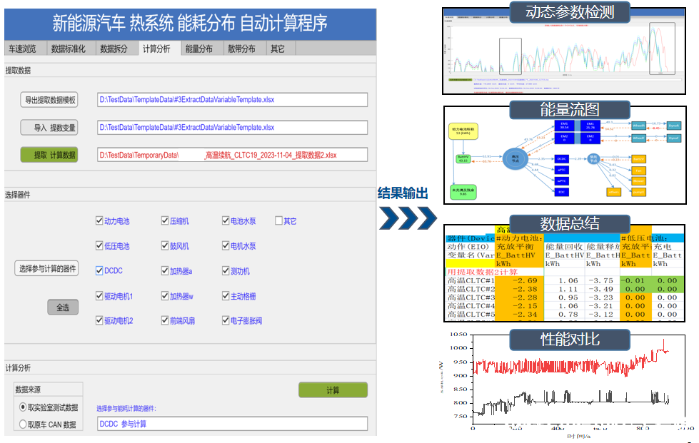 基于熱管理系統(tǒng)測(cè)試數(shù)據(jù),通過數(shù)據(jù)自動(dòng)化分析工具,可快速實(shí)現(xiàn)競(jìng)品車之間熱系統(tǒng)性能對(duì)比,為熱系統(tǒng)性能和控制策略優(yōu)化提供依據(jù)和方向。同時(shí),還可清晰梳理出熱系統(tǒng)的能耗情況,并羅列出各部件的詳細(xì)能耗,快速鎖定高能耗關(guān)鍵部件,方便以基于降能耗為目標(biāo)的控制策略優(yōu)化。