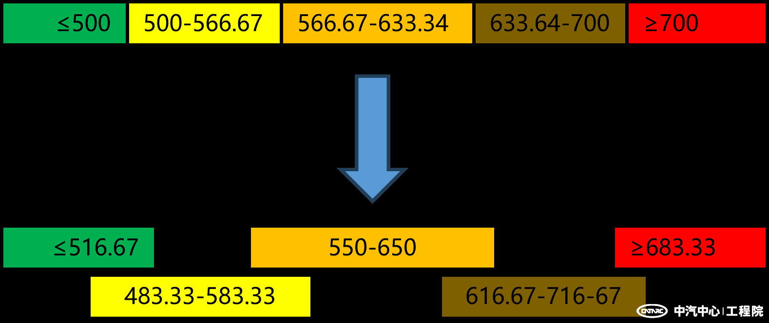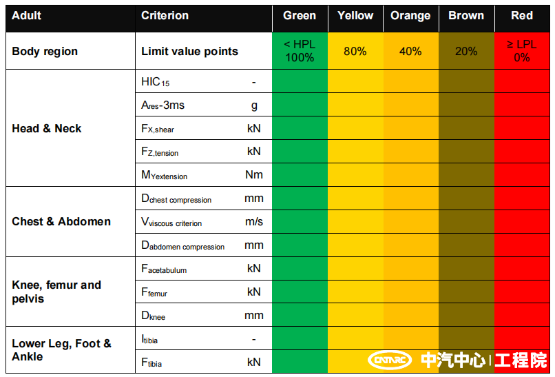 1. 得分計(jì)算由線性插值變?yōu)樯珟гu(píng)分。假人傷害評(píng)價(jià)區(qū)間按高、低限值三等分,得分色帶分別為綠色、黃色、橙色、棕色、紅色,對(duì)應(yīng)的得分比例分別為100%、80%、40%、20%、0%,得分比例基于假人身體部位的最高得分。