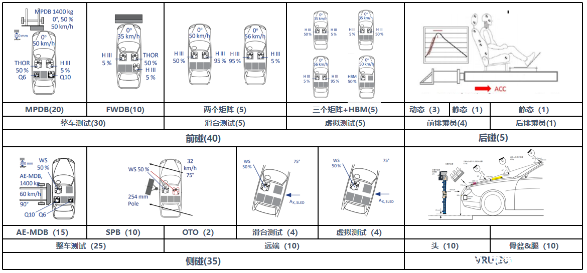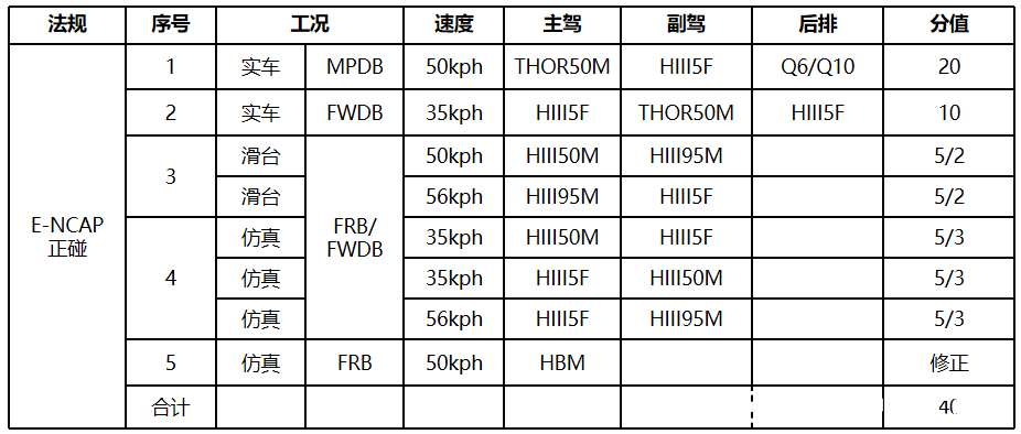 主要變化:整車(chē)正碰由50FRB變?yōu)?5FWDB,剛性墻前增加可變形蜂窩鋁壁障,副駕變?yōu)門(mén)HOR假人,考察老年人傷害,假人傷害限制變化,女性假人下肢由監(jiān)測(cè)改為評(píng)價(jià)項(xiàng),同時(shí)主副駕單獨(dú)計(jì)分。