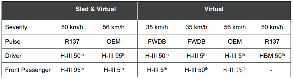 主要變化:正碰乘員多樣性通過(guò)滑臺(tái)試驗(yàn)結(jié)合虛擬測(cè)評(píng)進(jìn)行測(cè)試,并首次引入HBM人體模型進(jìn)行虛擬測(cè)評(píng)監(jiān)測(cè),乘員多樣性考察35km/h,50 km/h,56 km/h三種不同碰撞速度下假人傷害,使用 HIII 05F、50M、95M三款假人進(jìn)行乘員多樣性虛擬測(cè)評(píng)。