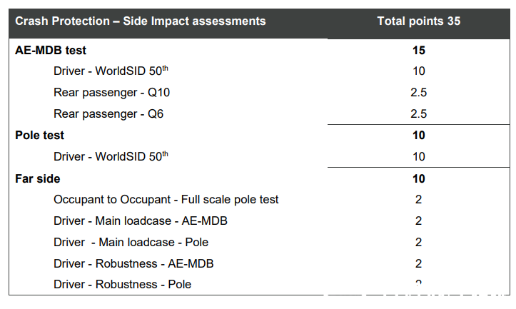 碰撞保護(hù)板塊分為正面碰撞、側(cè)面碰撞、后碰和行人保護(hù)四個(gè)子模塊,板塊總分100分,2026年五星得分率要求為80%。