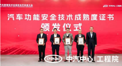 會議期間,中汽中心工程院基于已發布的“汽車安全技術成熟度評估”體系為首批獲得“汽車功能安全技術成熟度L5高成熟度證書”的四家企業頒發了證書。這一評估體系面向“功能安全、預期功能安全、AI安全”等新智安全技術前沿領域,能夠對零部件及整車企業的新智安全技術成熟度水平進行評估認證,這一體系緊貼日益收緊的法規要求和車輛全生命周期安全需求,為行業實現全域安全研發提供了良好示范。