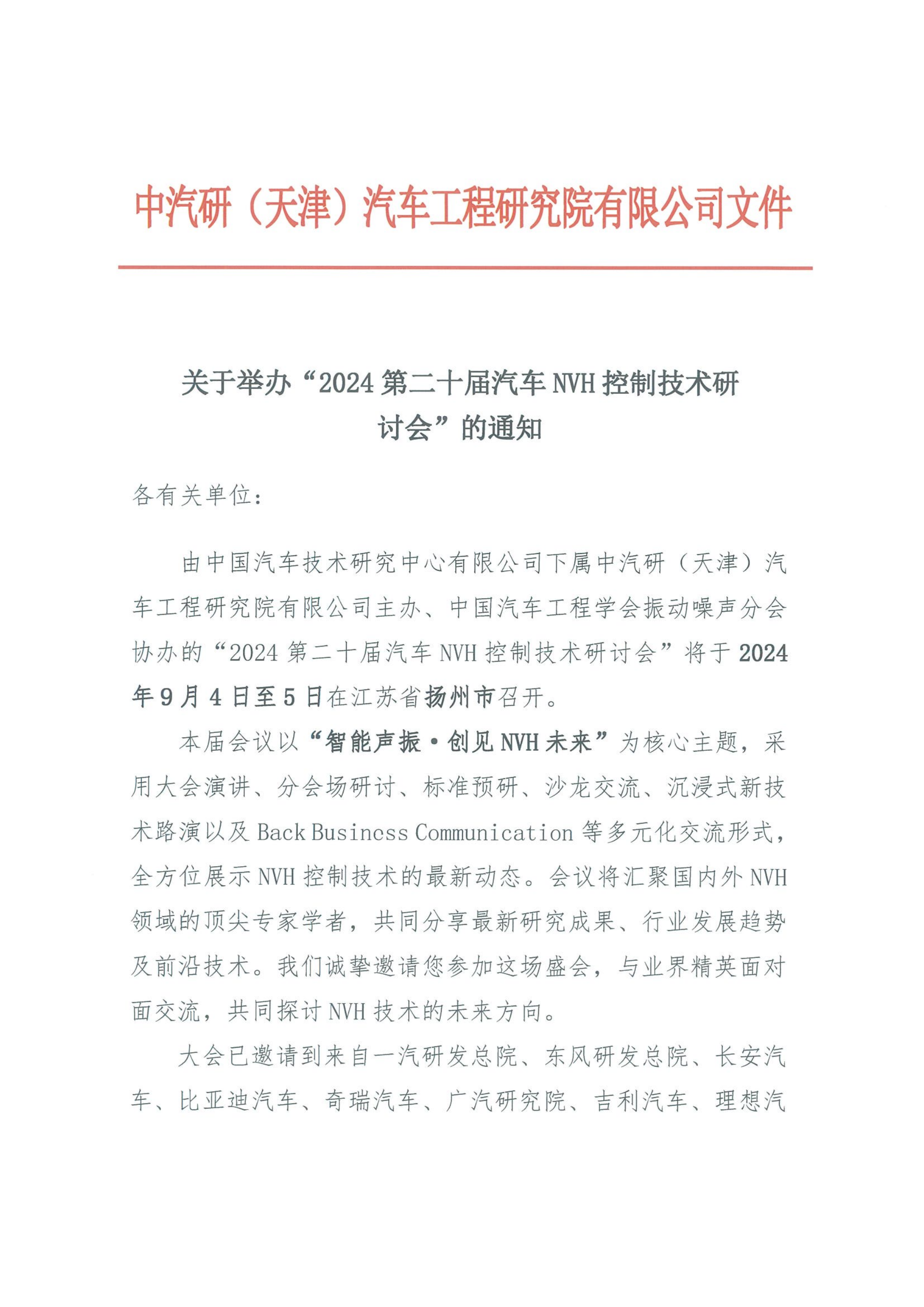 關(guān)于舉辦“2024第二十屆汽車NVH控制技術(shù)研討會”的通知