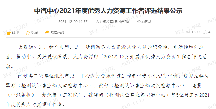 - 高潔同志獲得2021年度中汽中心宣傳工作先進個人。